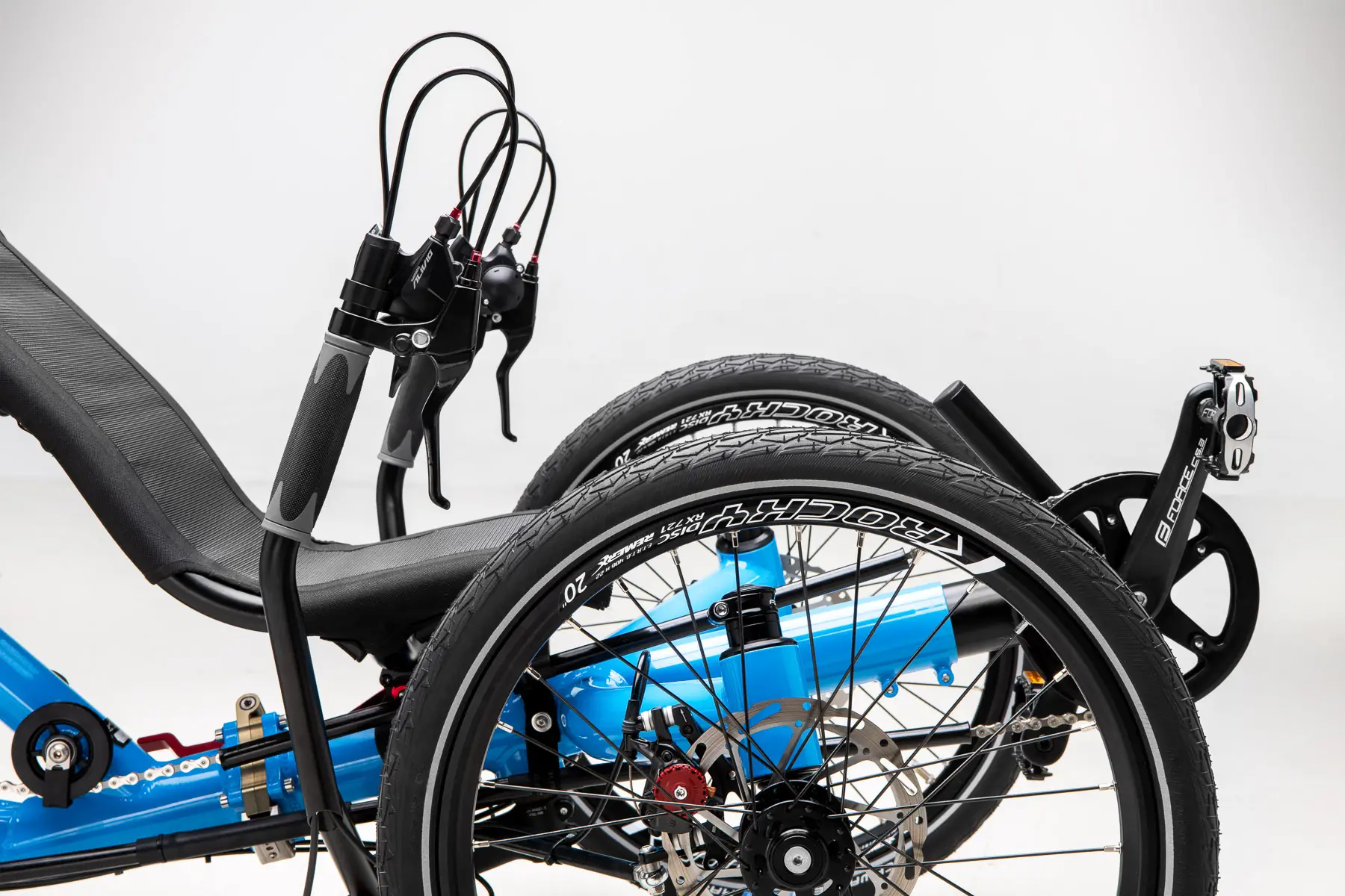 Let’s take a closer look at it. The T-Trisek is a recumbent trike with no suspension, but you can purchase it with a folding hinge for an additional fee, so It can easily fit in your car, a basement, or a small garage. And because we build our trikes according to the wishes and needs of our customers, you can also have the T-Tris made in different colors or even color combinations, with several different types of drivetrain, with or without an electric motor and, of course, with a lot of accessories, including headrest, for example. You can see all the options in our configurator, where there are also displayed different adaptations for people with disabilities, such as the high seat adapter, grab handles, modification of gear shifters or brakes so that they can be controlled with one hand only, electronic or even automatic shifting, and much more.