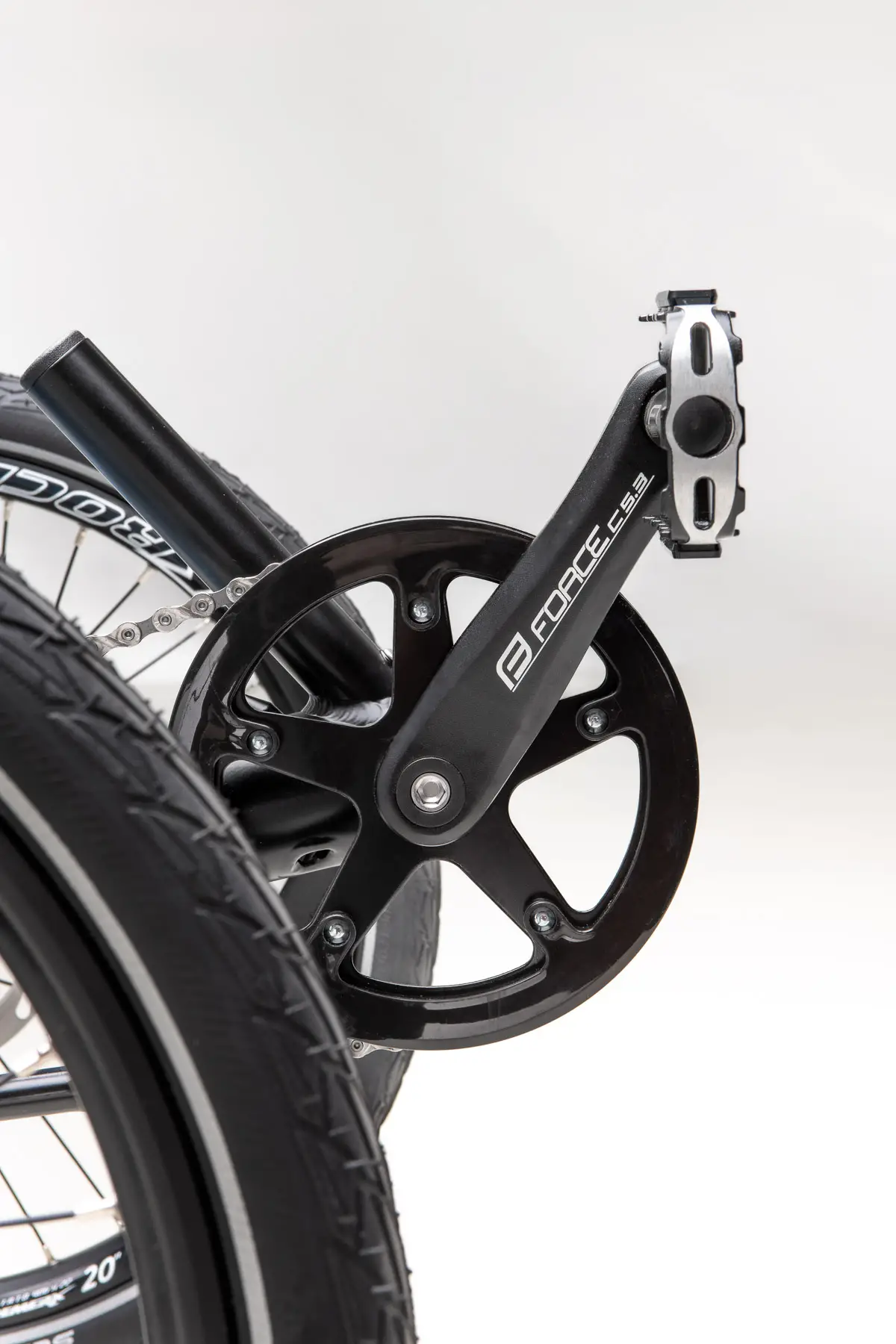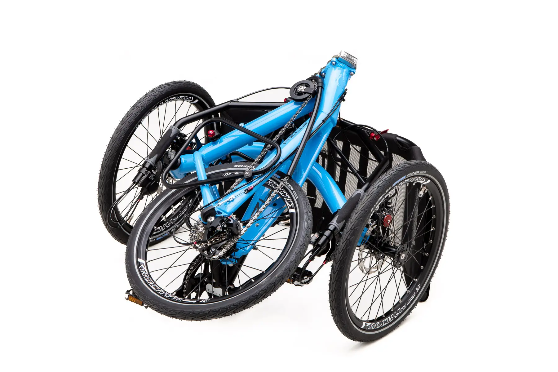 The folding mechanism on our tricycles is positioned in such a way that when you start folding the rear of the frame, the trike slowly “turns” and the rear wheel ends up folded flat. You also remove the seat and, if necessary, also the wheels, so the resulting package is remarkably small.