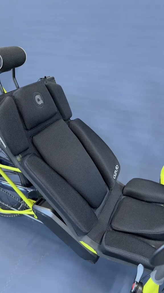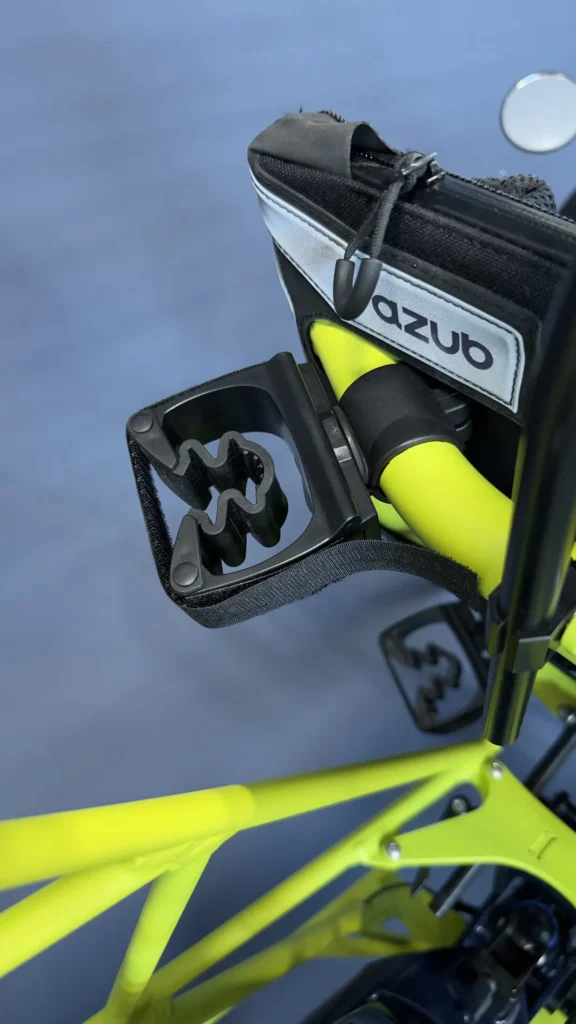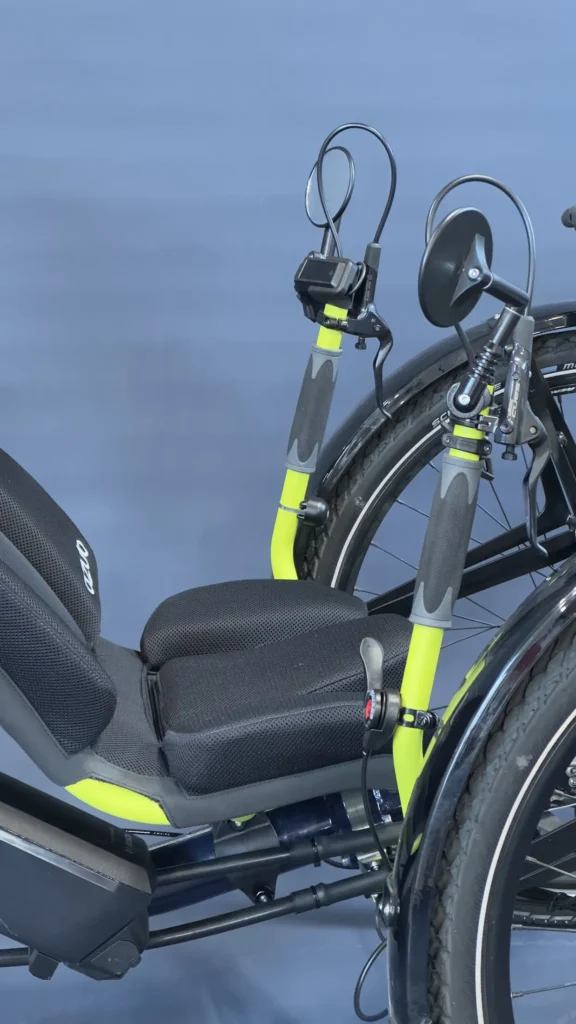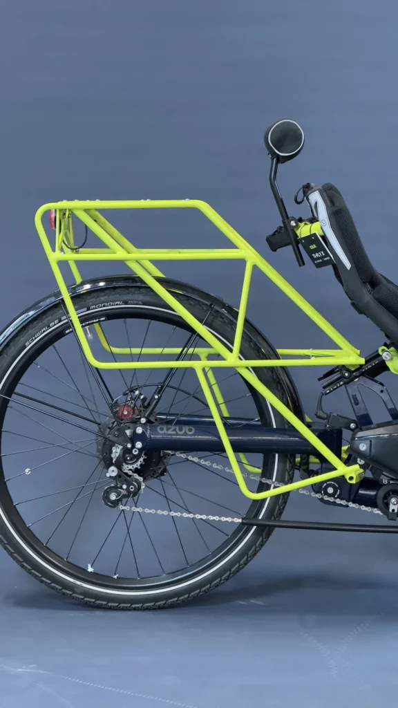 This Ti-Fly X isn’t a custom build for a specific customer, so it doesn’t have a unique personal story – yet. But it definitely deserves a spotlight. It’s a top-spec machine packed with everything we love about modern recumbent technology. And the best part of this trike? The colors, because these are the AZUB colors!