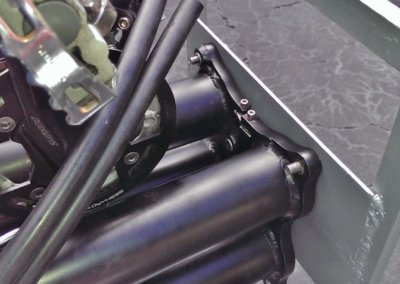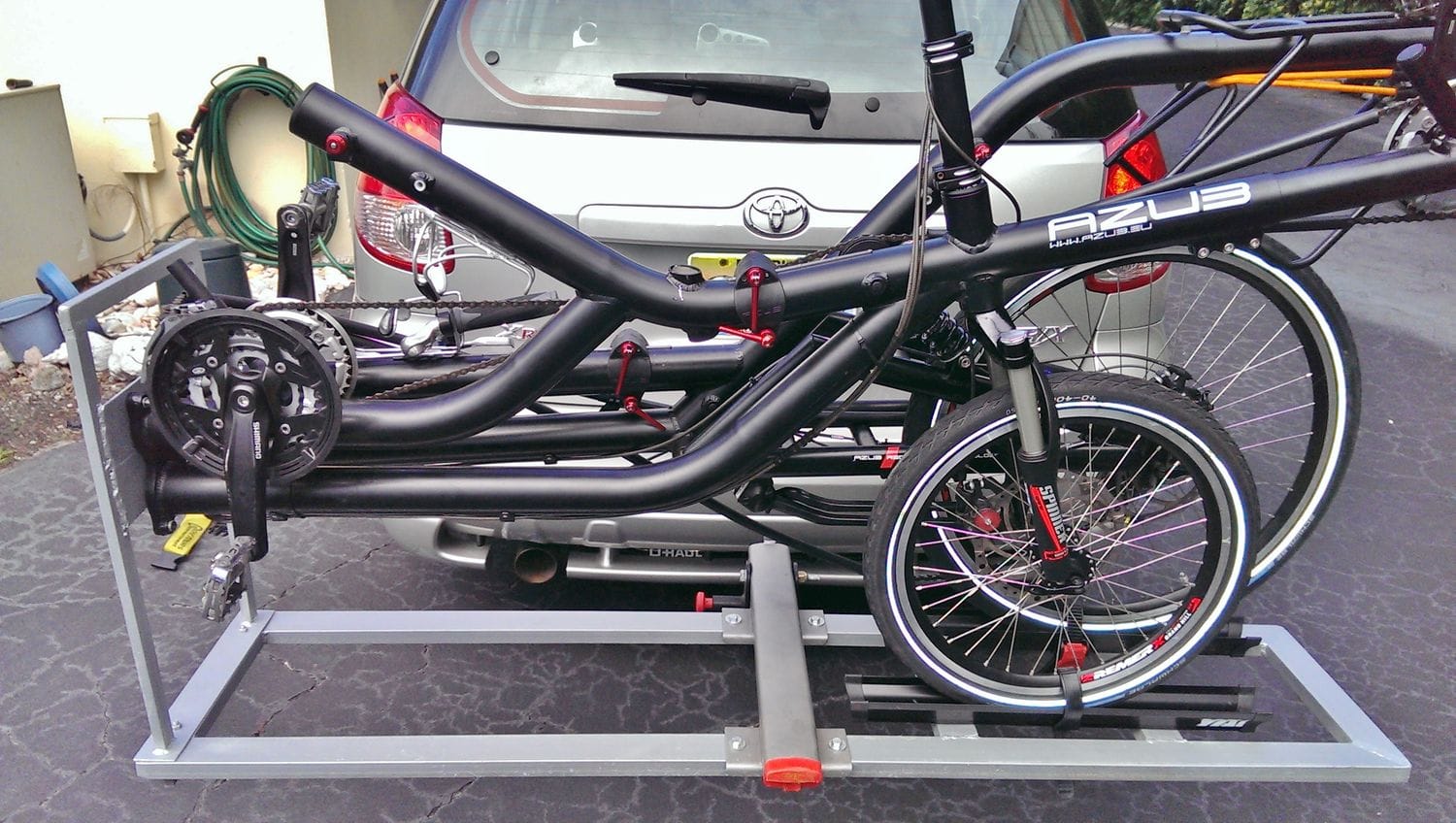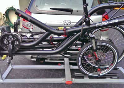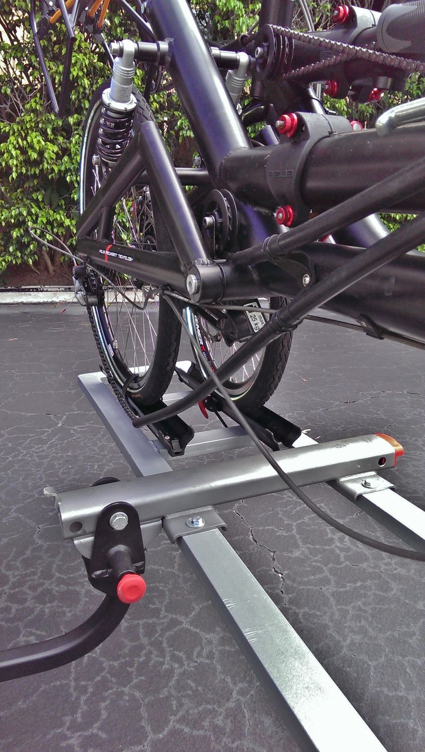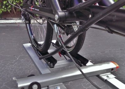 “It certainly lacks elegance, but it works. The platform with attachment plate (left side, for bolting in place the hinged end of the folded Twin frame) I designed and had fabricated by a local welding shop. I purchased from www.etrailer.com the Yakima replacement spine assembly for 1-1/4″ HoldUp model bike rack, along with the Yakima wheel tray that is used on a number of the Yakima roof rack bike carriers. Could have made it more elegantly but used metal stock on hand.”
