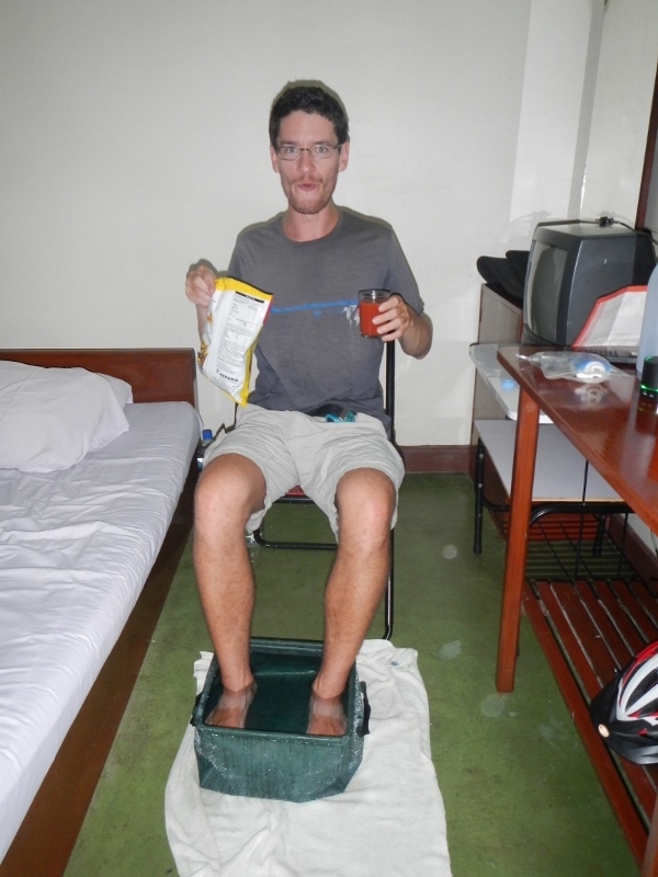 Thailand: we crossed the border on 6th of February –> Stephane’s birthday. We threw a huge party: tomato juice, nachos, footbath and off to bed at 7:00pm!