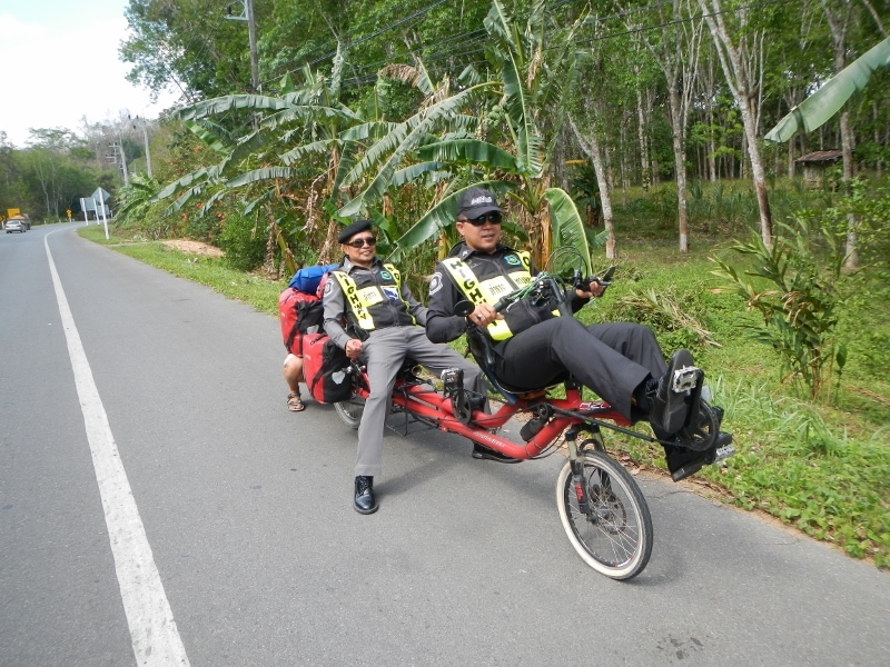 After Thailand, we headed south towards Malaysia and especially Kuala Lumpur. 2km from the border, a couple of Thai policemen stopped us. We were a bit surprised because it was the first time in Thailand that we were being stopped by the police. In the end, all they wanted was to get a picture of them on the tandem…