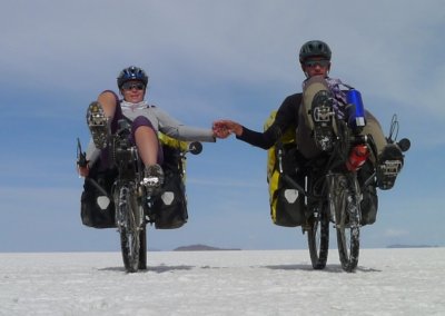 The return trip to La Paz was not so exhilarating as Angelique got one of her pannier stolen at the bus station. The police was useless of course but luckily we were able to buy most of the stolen equipment in the city: new sleeping bag, new Gore-Tex trousers, new gloves etc… So we set off again towards our next goal: the mighty Salar de Uyuni! 50km after Challapata we left the asphalt and met the dirt road: the next 135km to the northern entrance of the salar at Tahua took us 2 ½ days: the further we went the worst the road! At some point we were shaking so much on the washboard that our average speed on flat terrain did not exceed 8km/h! And before Tahua, the road became a pure mountain biking track! It was not easy but we were cycling in one of the most beautiful landscapes in the world! And then that was it: we were on the edge of the salar and there was nothing but whiteness in the horizon! As we gave our first pedal strokes on the crispy salt, we felt like sailors lost in the vastness of the ocean. The compass was our master, and guided us safely to the Isla Incahuasi, the famous Cactus Island in the middle of the desert. We arrived in late afternoon and had the privilege to be the only tourists on the island that night: the view as the sun set was amazing. The next morning however, we were awaken just before sunrise by a mass of tourists on jeeps tours from Uyuni. It was time to go. We cycled across the 70km of salt to the exit in Colchani and continued to the town of Uyuni. We then decided to book a package tour across South Lipez, the high altitude region of South West Bolivia. The next three days would take us from lagoon of every possible colour (from red to green) inhabited by flamingoes, to vast deserts inhabited by vicunas and viscachas (rabbit like rodents) surrounded by volcanoes, to busting geysers and singing fumaroles.