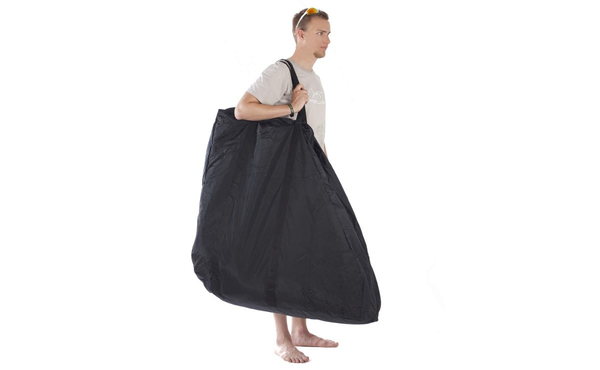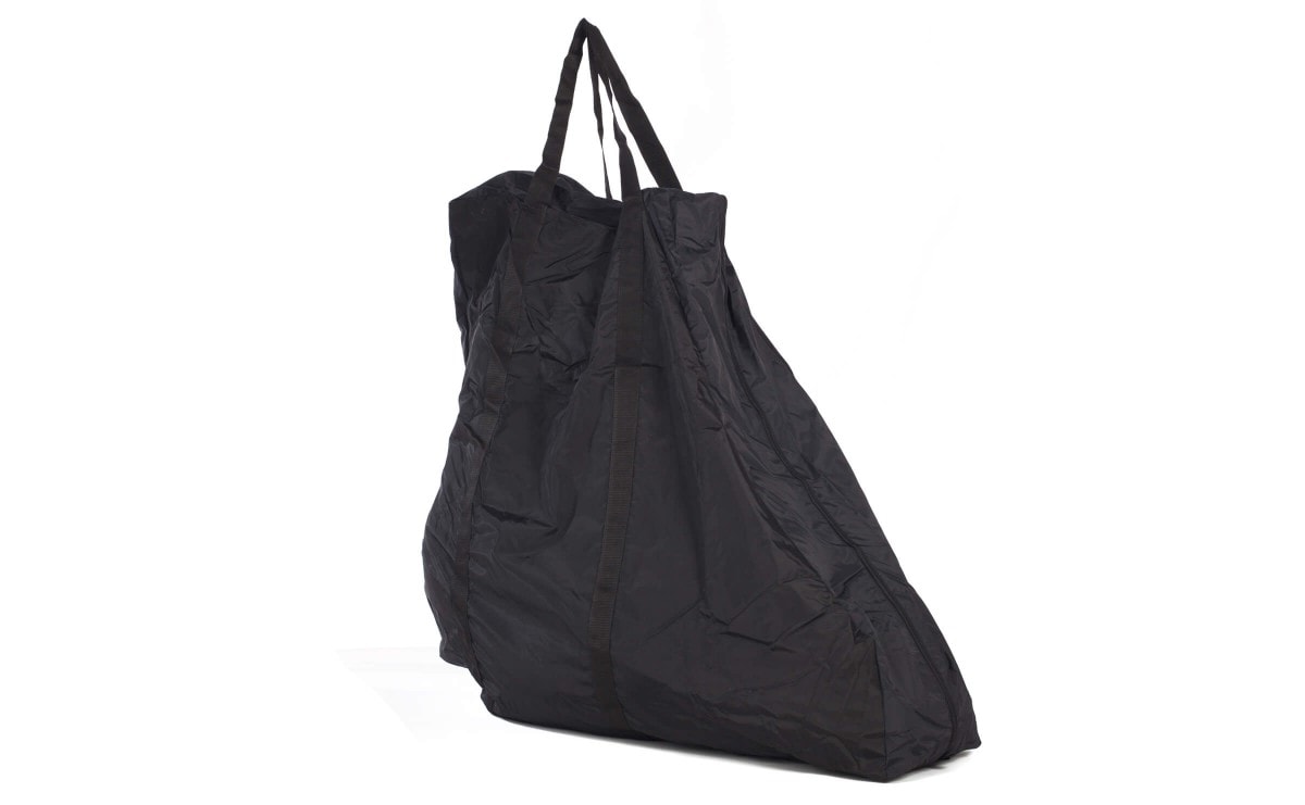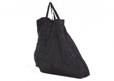 Obal na AZUB Origami. Stačí kolo kompletně složit, sklopit pedály a zasunout šlapák co nejvíce do rámu. Obal je bez polstrování a pro kolo je základní ochranou při transportu autem či vlakem, ale použít se dá i při letecké přepravě. Jeho obrovskou výhodou je, že se po zabalení do přiloženého obalu dá zavěsit pod sedlo pomocí dvou suchých zipů.