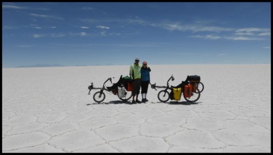 The return trip to La Paz was not so exhilarating as Angelique got one of her pannier stolen at the bus station. The police was useless of course but luckily we were able to buy most of the stolen equipment in the city: new sleeping bag, new Gore-Tex trousers, new gloves etc… So we set off again towards our next goal: the mighty Salar de Uyuni! 50km after Challapata we left the asphalt and met the dirt road: the next 135km to the northern entrance of the salar at Tahua took us 2 ½ days: the further we went the worst the road! At some point we were shaking so much on the washboard that our average speed on flat terrain did not exceed 8km/h! And before Tahua, the road became a pure mountain biking track! It was not easy but we were cycling in one of the most beautiful landscapes in the world! And then that was it: we were on the edge of the salar and there was nothing but whiteness in the horizon! As we gave our first pedal strokes on the crispy salt, we felt like sailors lost in the vastness of the ocean. The compass was our master, and guided us safely to the Isla Incahuasi, the famous Cactus Island in the middle of the desert. We arrived in late afternoon and had the privilege to be the only tourists on the island that night: the view as the sun set was amazing. The next morning however, we were awaken just before sunrise by a mass of tourists on jeeps tours from Uyuni. It was time to go. We cycled across the 70km of salt to the exit in Colchani and continued to the town of Uyuni. We then decided to book a package tour across South Lipez, the high altitude region of South West Bolivia. The next three days would take us from lagoon of every possible colour (from red to green) inhabited by flamingoes, to vast deserts inhabited by vicunas and viscachas (rabbit like rodents) surrounded by volcanoes, to busting geysers and singing fumaroles.