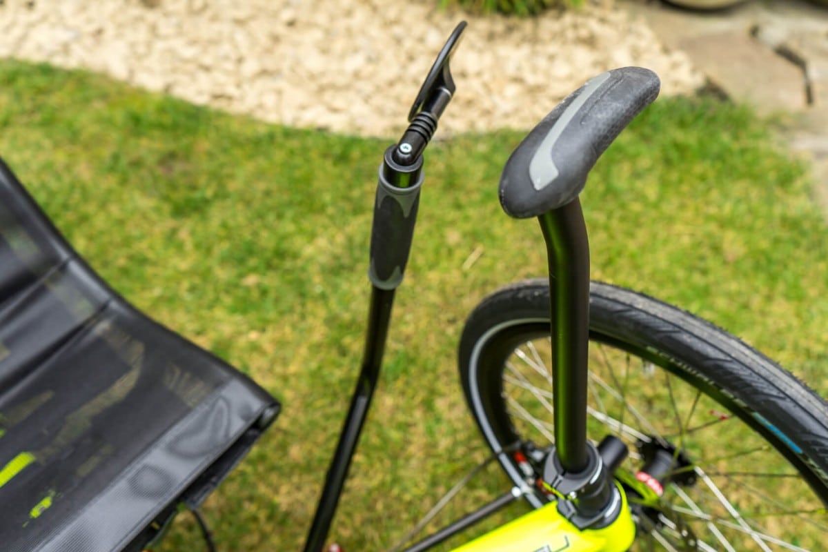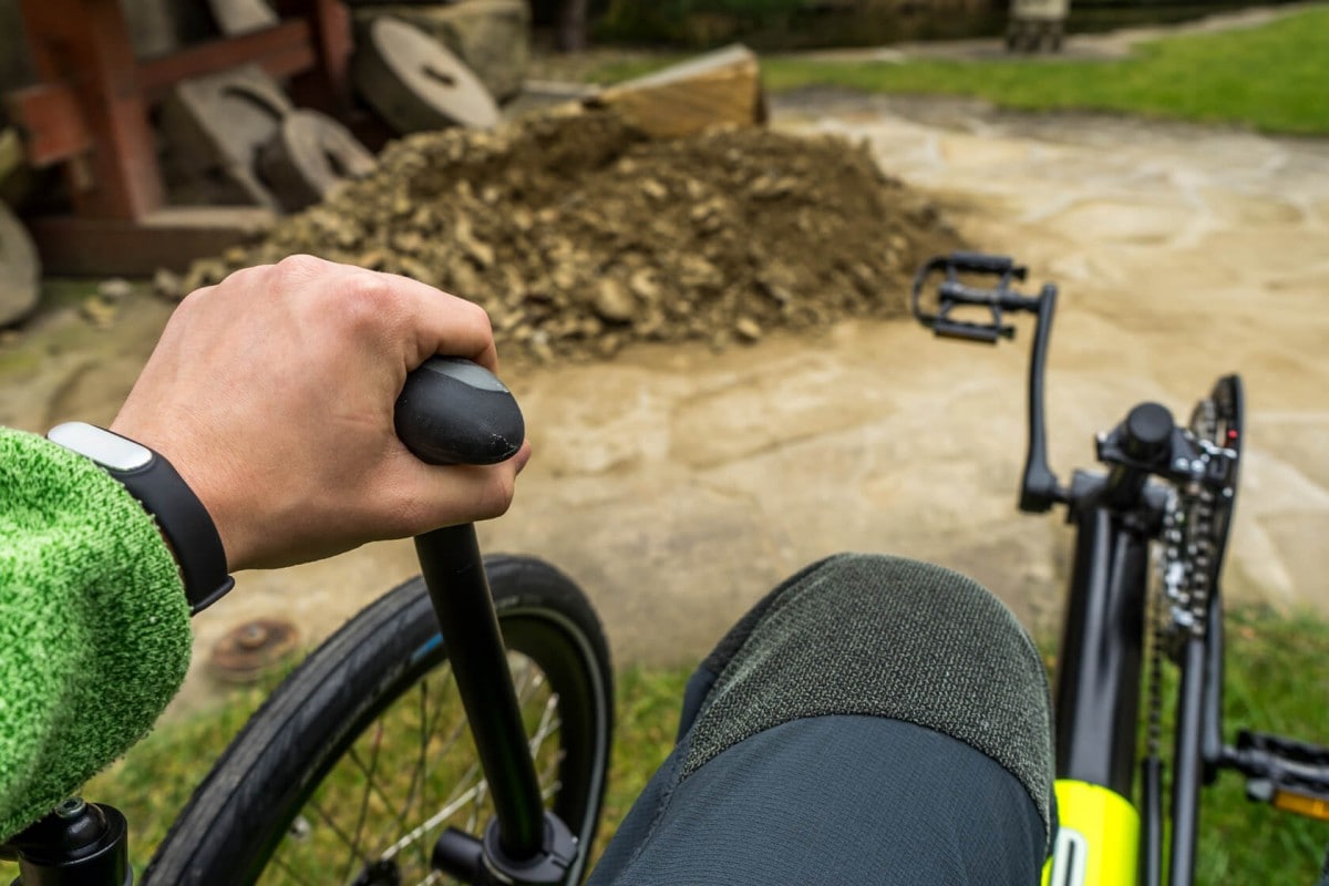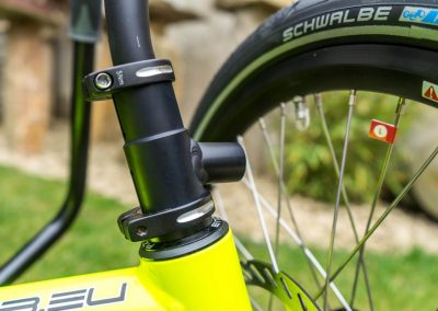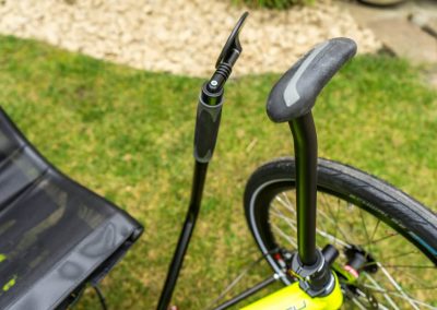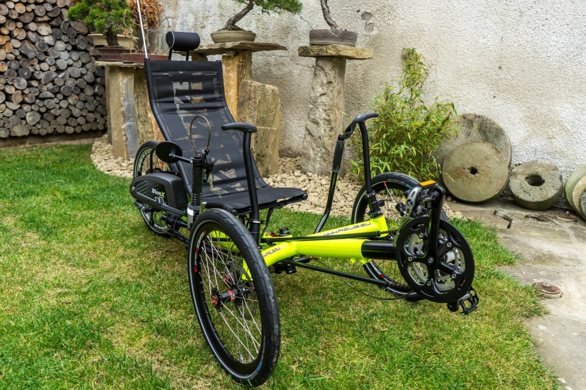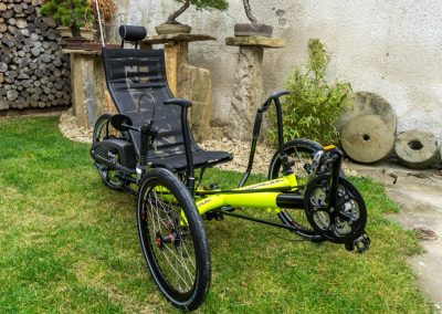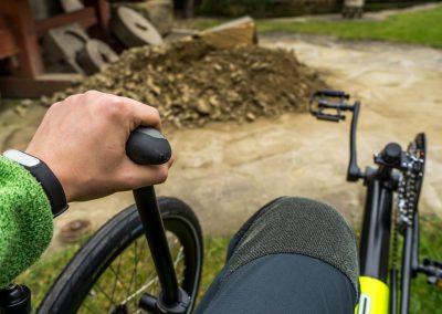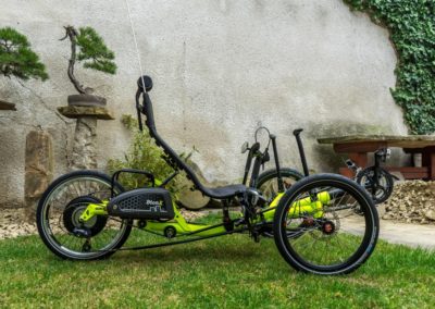 We got here another really custom build trike for the disabled rider whose is not possible to shift/brake with his left hand. So every needed features are on right side of the handlebar. Grip shift for real derailer shifting and on the top, you can see levers for front derailer. And only one braking lever for both front brakes! Also on the handlebars are placed BionX central unit and lever for the rear parking brake. One of the newest feature on this trike are grab handles.