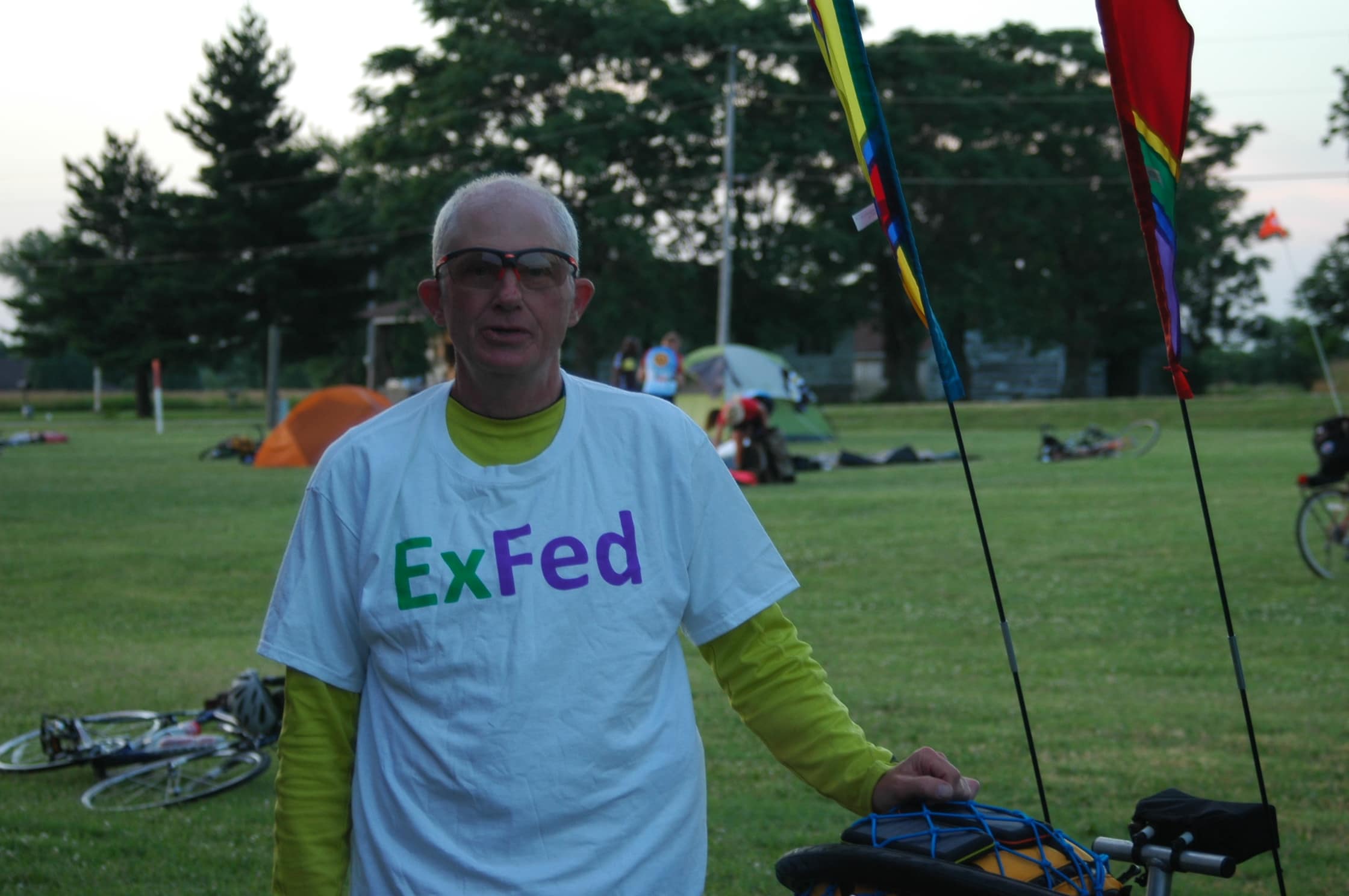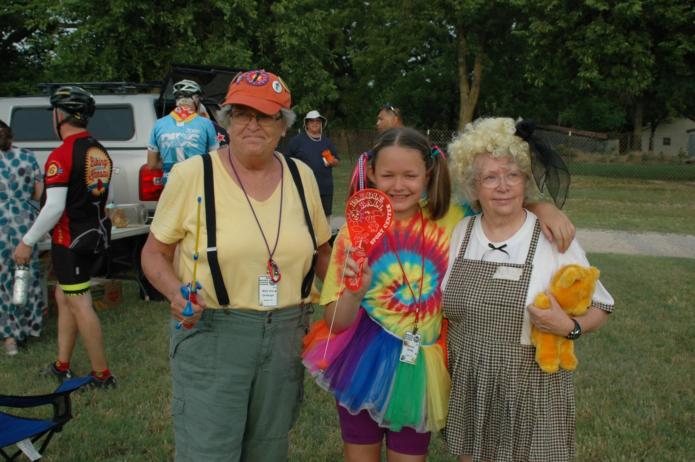 The heat and humidity turned out to be my greatest obstical on this journey with the record for me on my “Garmin” getting to 136.7 and someone telling me that we had 76% humidity that afternoon. As we came into town one afternoon about 3/4 of a mile from the stop I saw an ice-cream shop and just pulled in and had a big bowl before getting in and looking for my duffle bag and sleeping bag, well worth that extra time I think. I got a t-shirt from the retirement place just before I left and they asked for a picture wearing it so as I was loading the trike for the last days ride I got a kind soul to take the picture with my camera then got rolling. Another interesting find along the way was someone who made me look a rank amateur in the ‘hardcore’ category of rider, she was ridding a mountain bike with platform pedals and rode barefoot, I asked her at an aid station one morning if she minded me taking her picture for that very reason and she was very accommodating and gracious and posed for the picture before taking off again. Likely I will only remember the fun things and lose sight of the heat and hills by the time it comes around to sign up for this ride again and will be doing it to say “I did it again”. The food was good, the ride had moments of sheer endurance, but then there were lots of “just WOW” moments like sunrises or seeing critters or watching the business of farming and harvest going or finishing the ride each day or completing the entire ride that made it fun.”