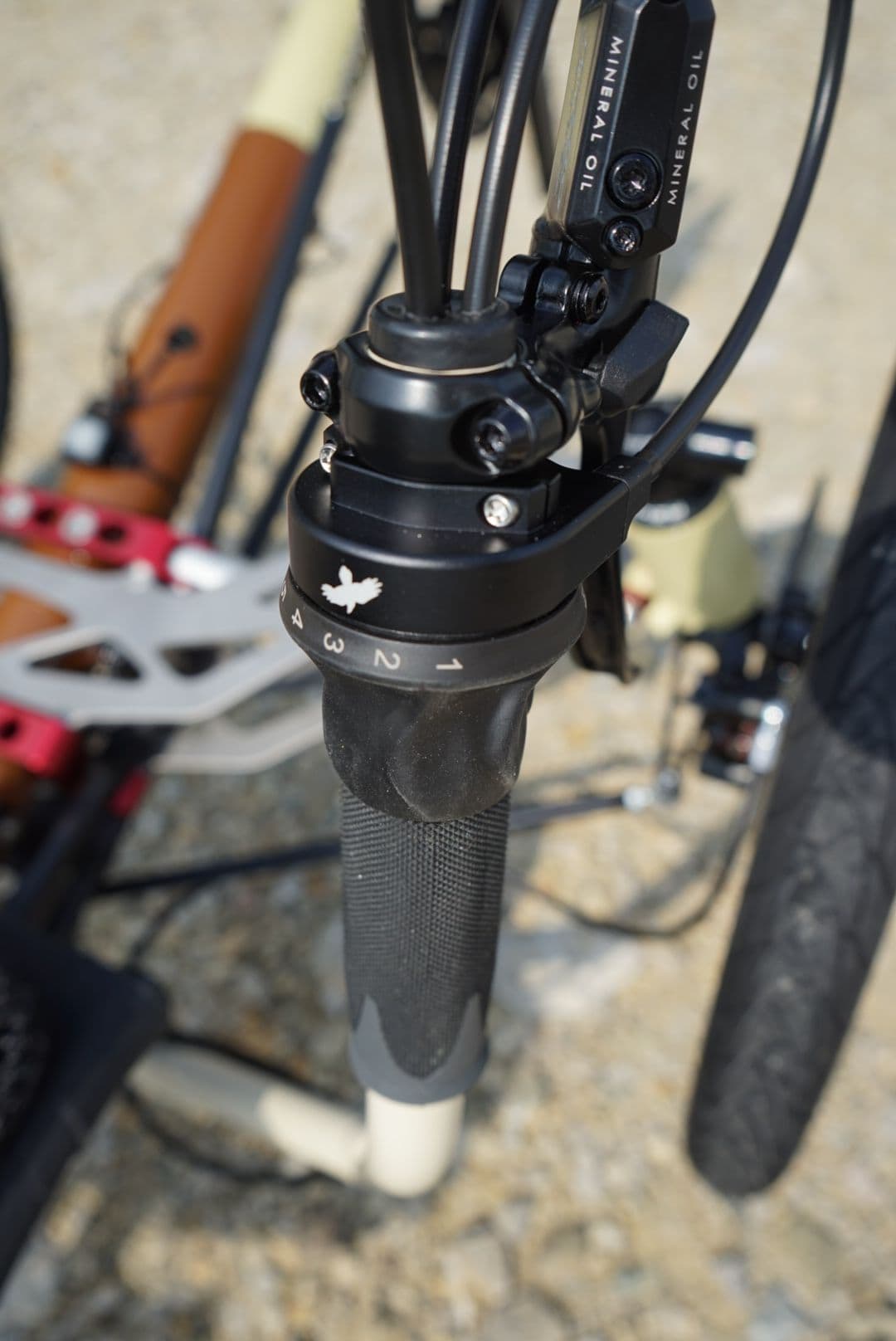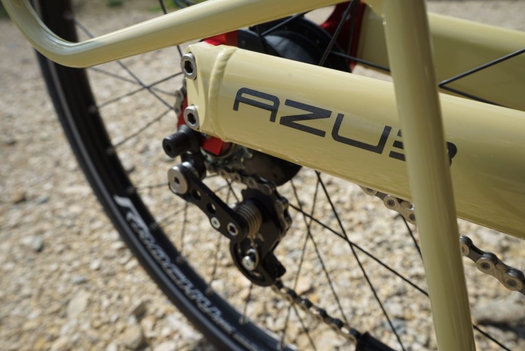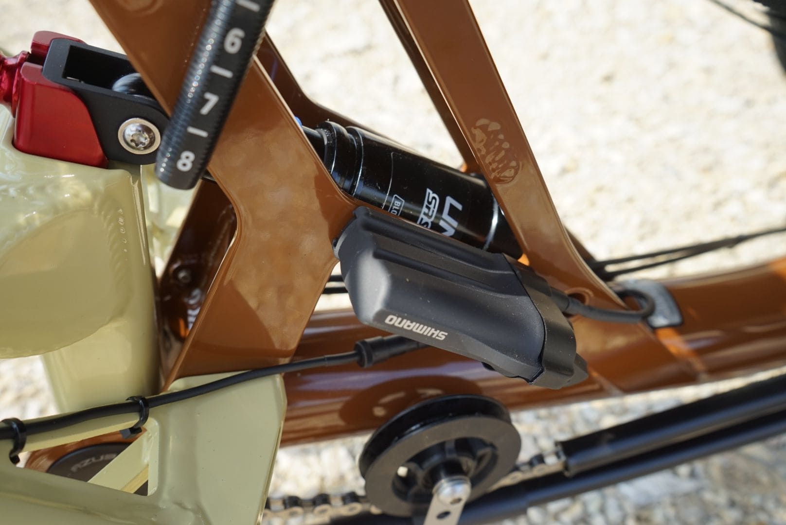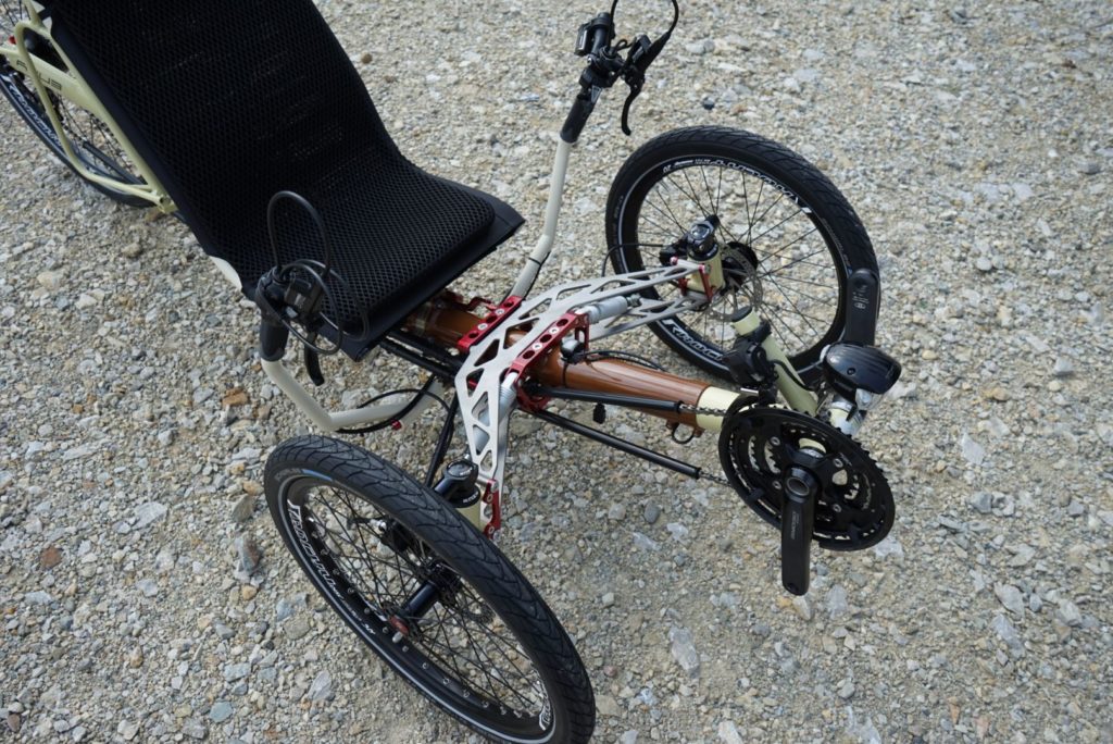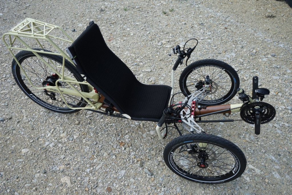 James is a huge AZUB fan and we have published an article about his recumbent travels already. He has a second AZUB now which is the Ti-FLY 26 with front titanium suspension and it is the very best example of our EPIC level of custom builds. The trike has not only custom coloring, but also Rohloff 14 speed gear hub paired with double crankset in the front. The front derailleur is Shimano XTR Di2 with electronic shifting. James wanted electronic shifting for Rohloff as well, but there isn’t any available now on the market except for the version for Bosch e-motors.