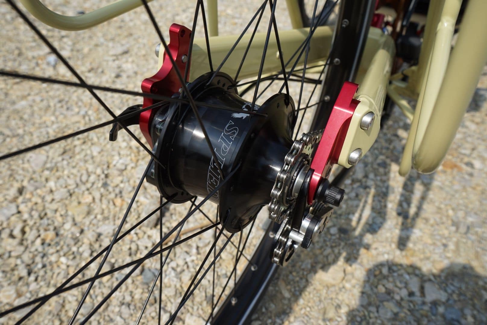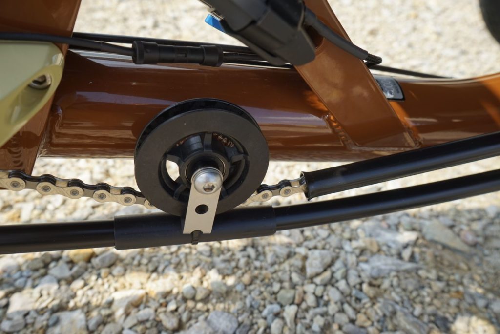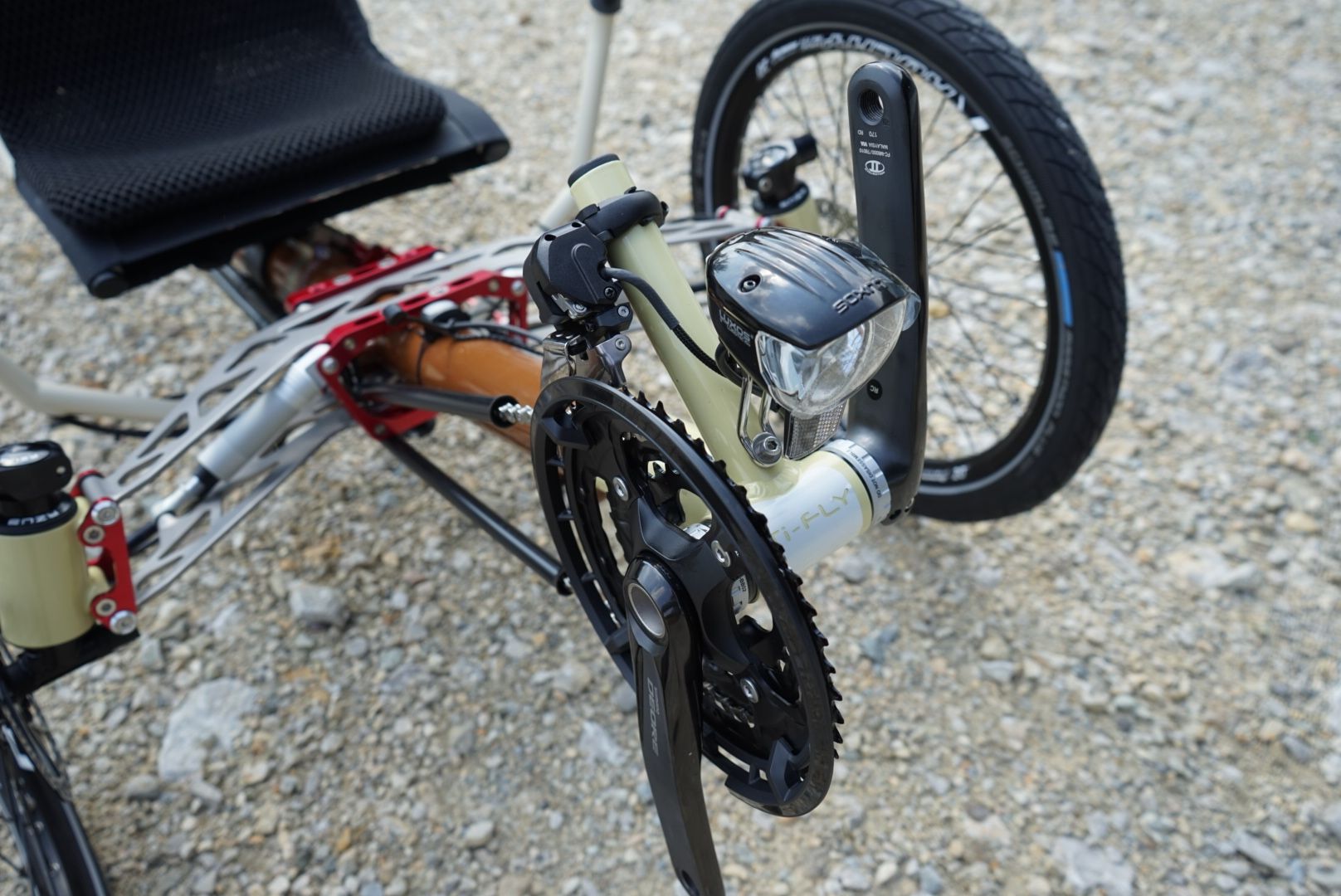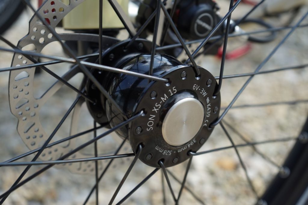 The trike is also unique because we have used the new SON XS-M 15 hub dynamo for trikes for the first time here. It is based on the SON 28 for 15mm through-axle and the axle itself is 2x stronger than the commonly used 12mm axle is. The dynamo has also lower drag. Also the distance between flanges is almost the same of the hub on the other wheel. This is simply much better hub dynamo for trikes!