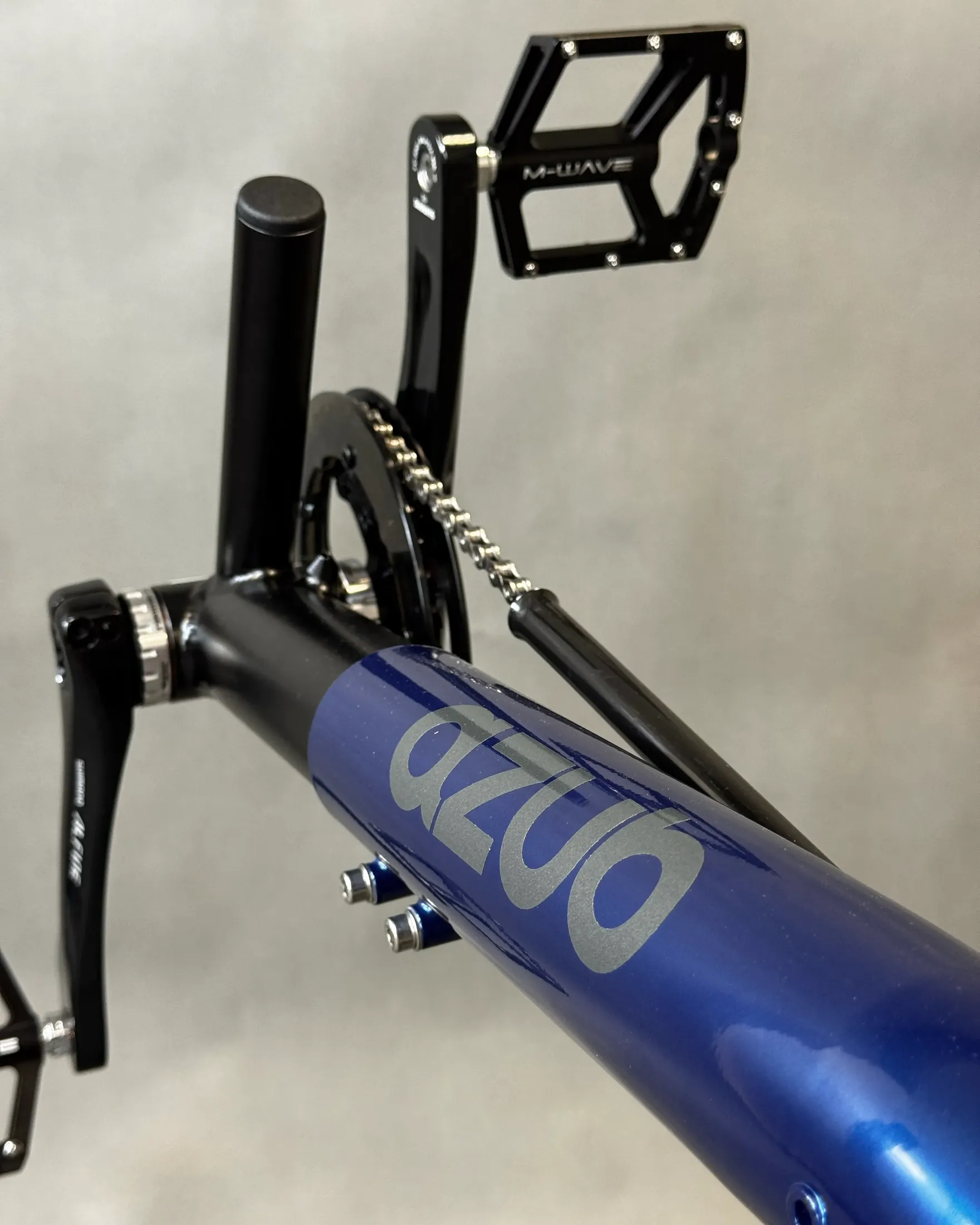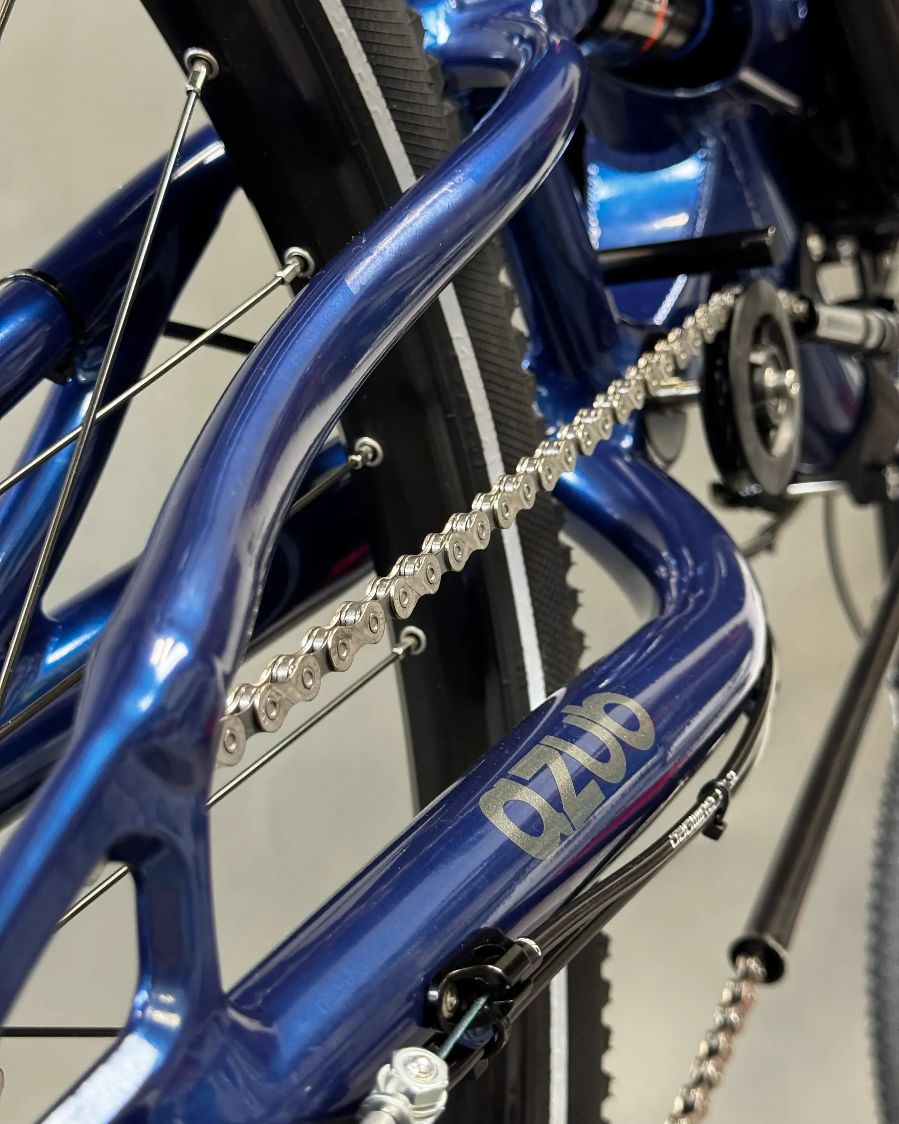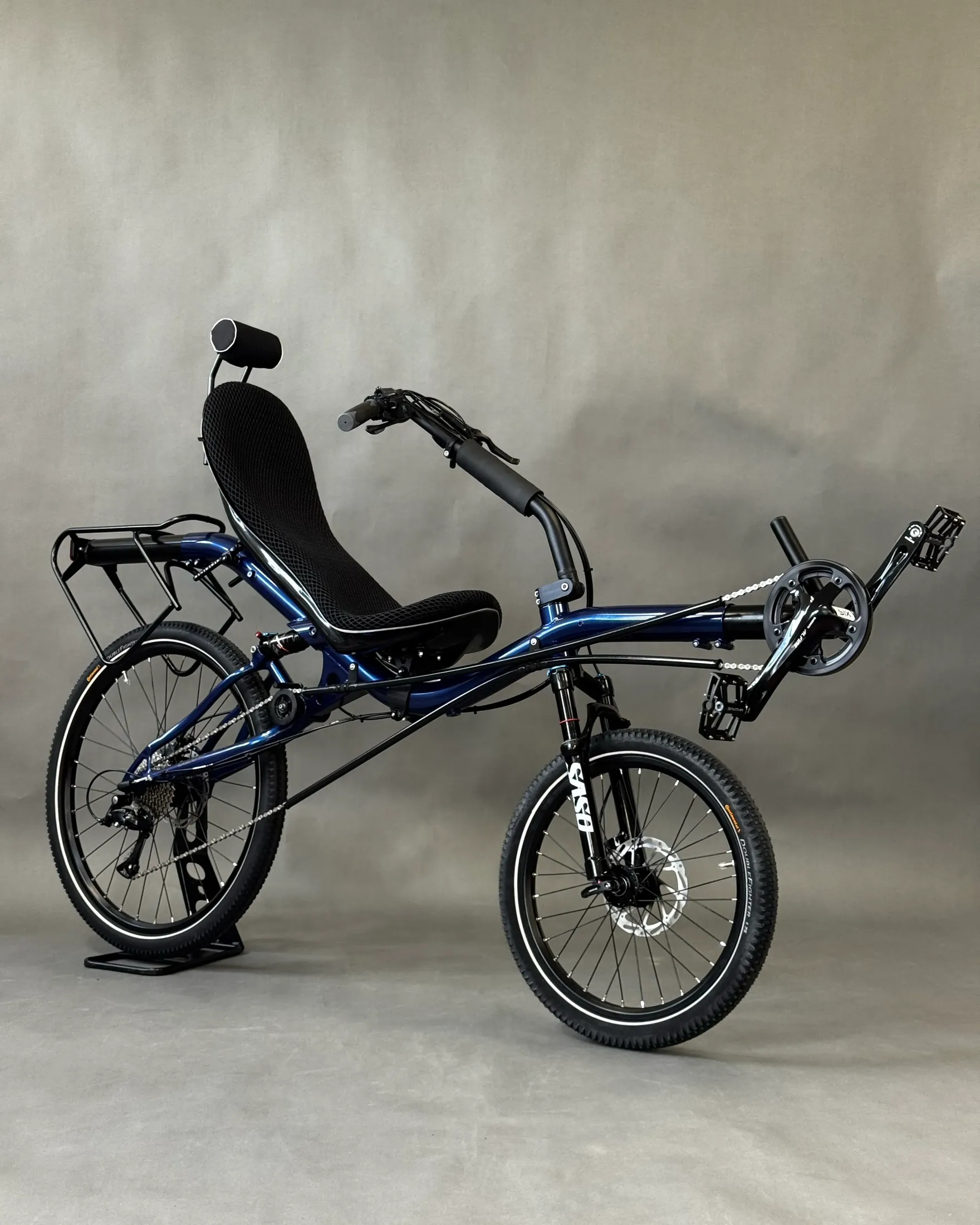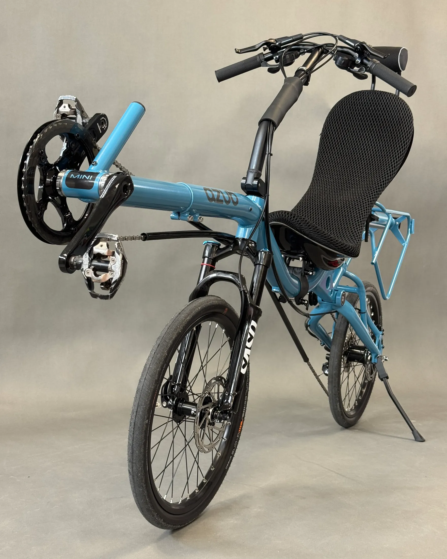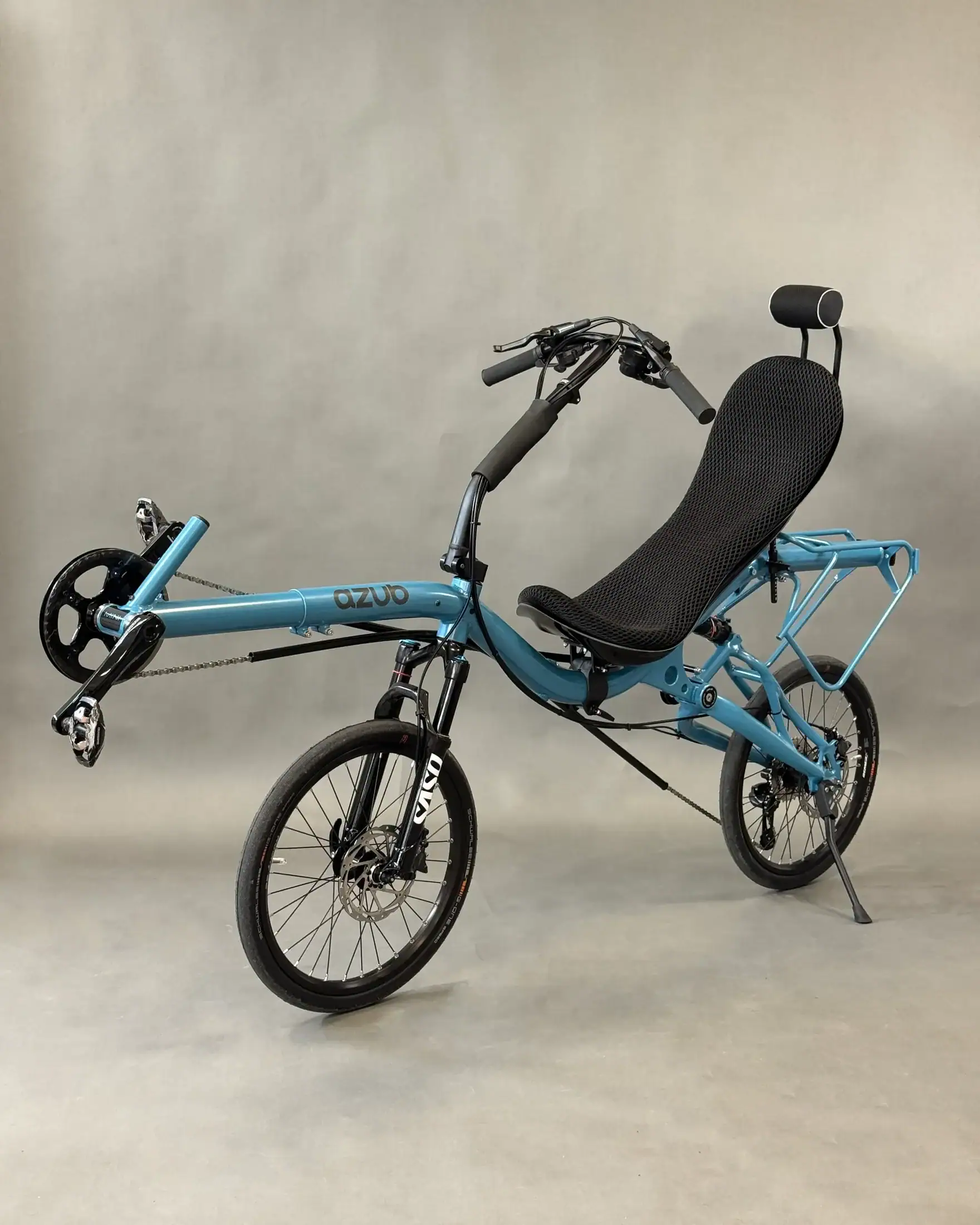 David chose the AZUB SIX, featuring a different frame geometry compared to the MINI, Pearl night blue color, and a 26″ rear wheel, while the MINI has 20″ wheels front and back.