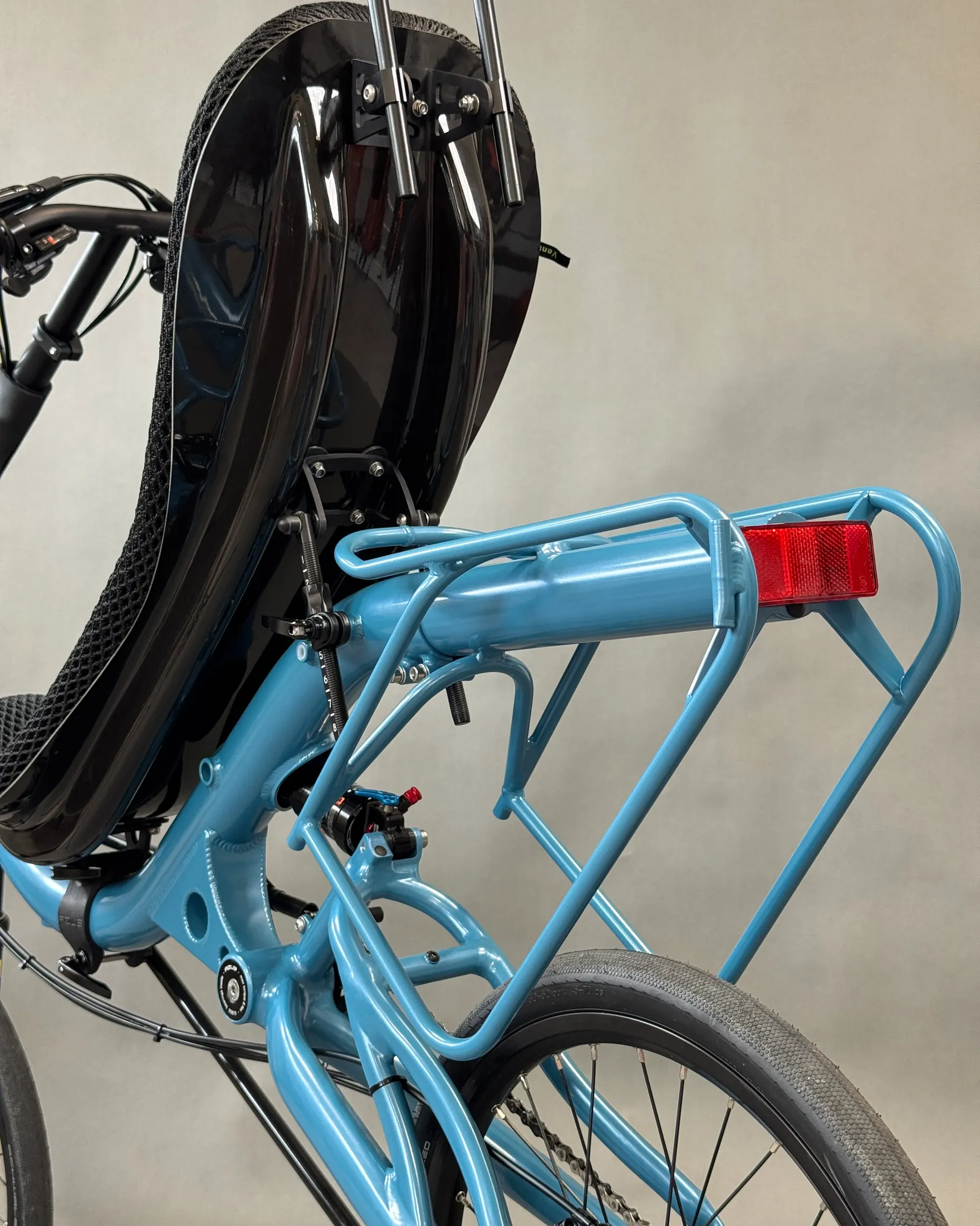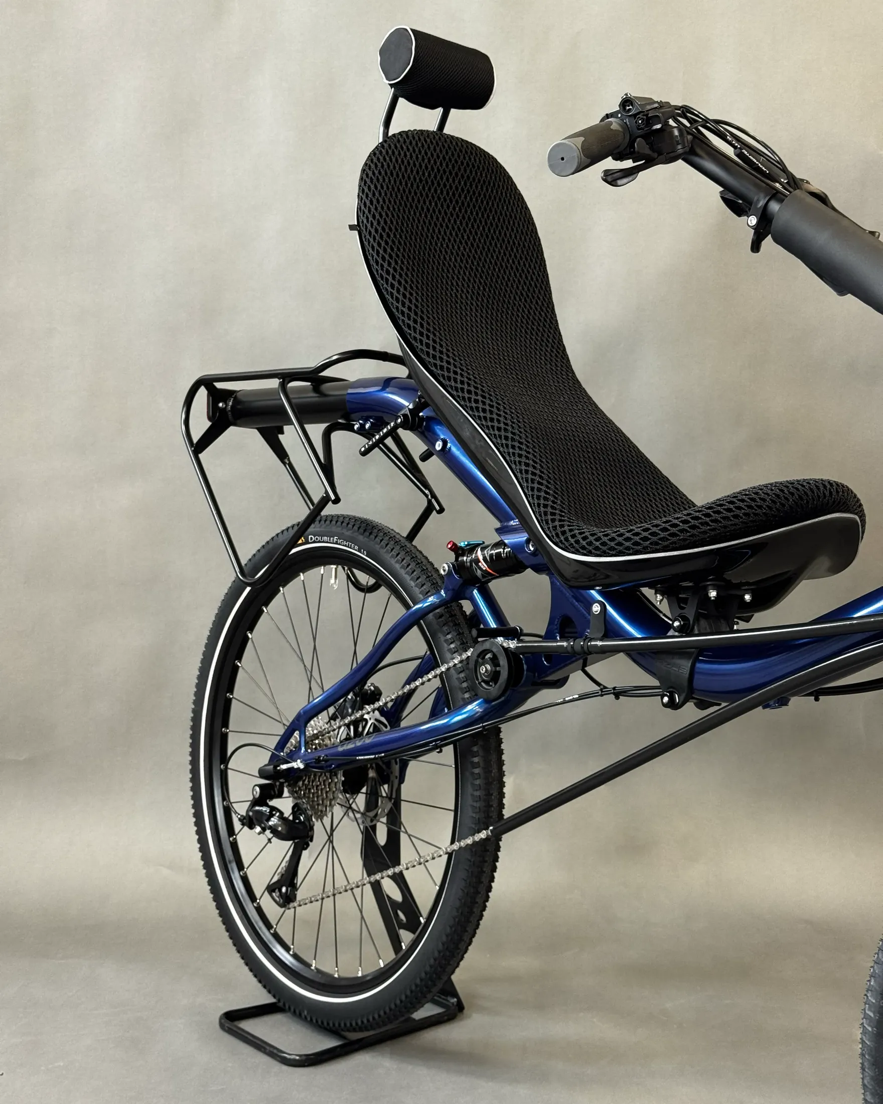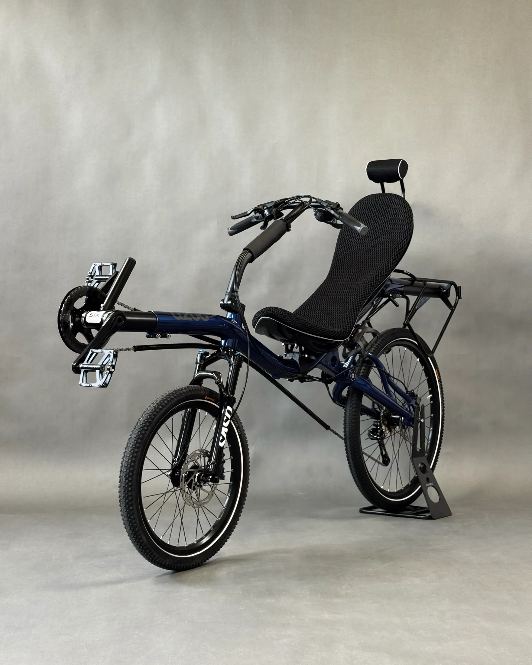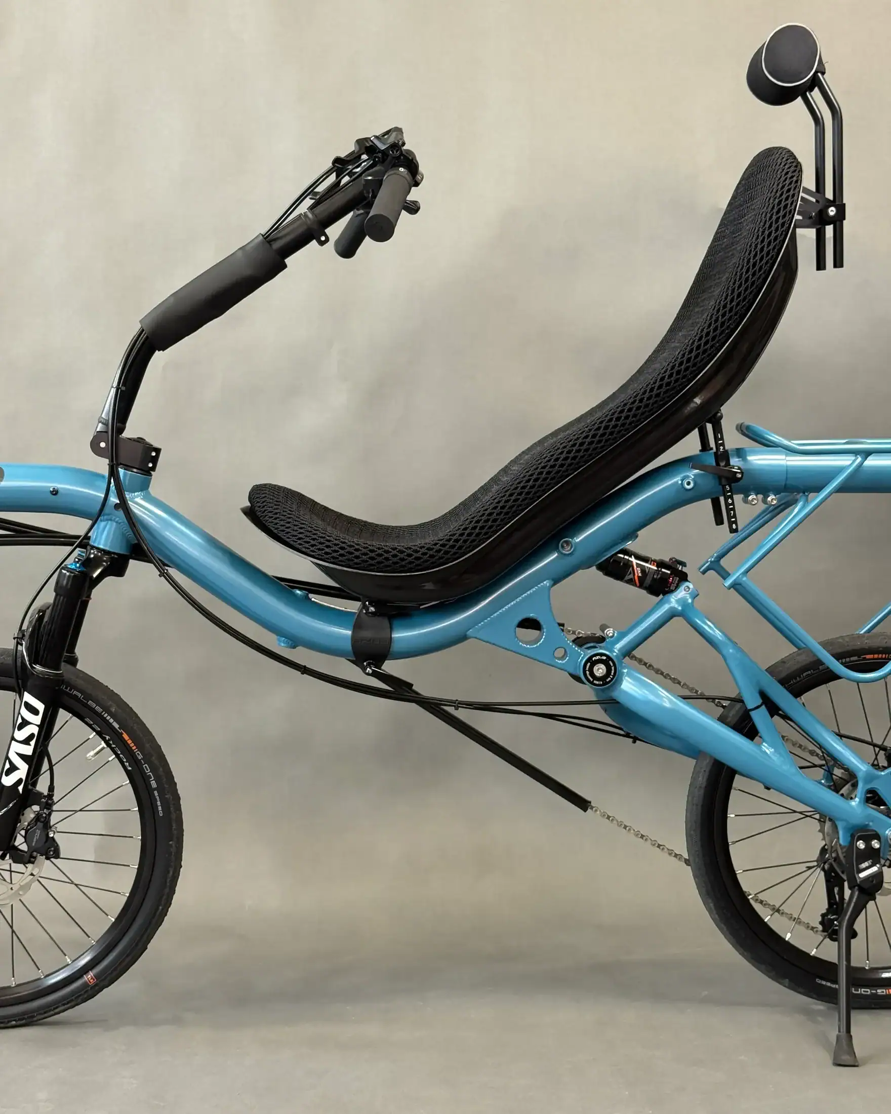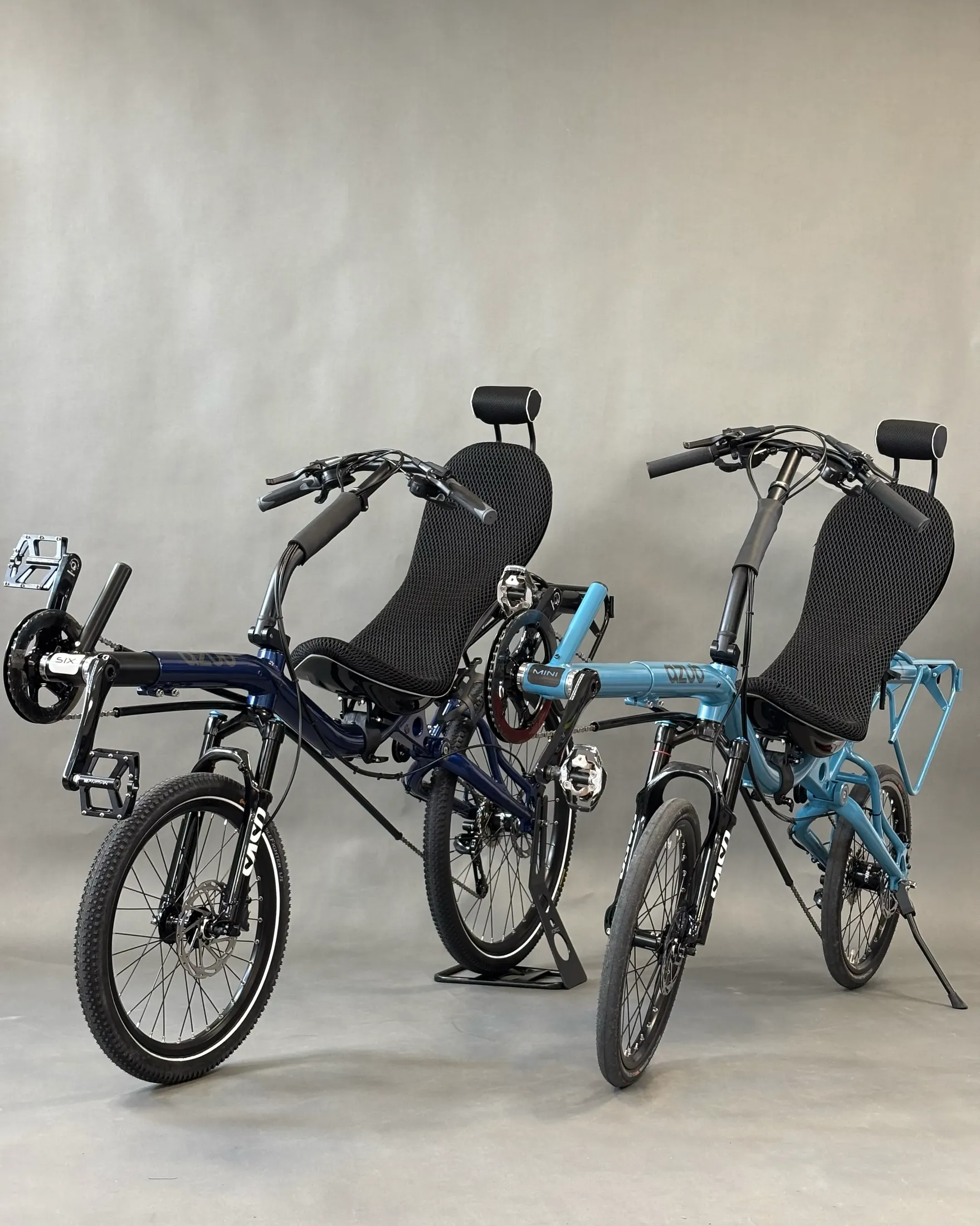 David chose the AZUB SIX, featuring a different frame geometry compared to the MINI, Pearl night blue color, and a 26″ rear wheel, while the MINI has 20″ wheels front and back.