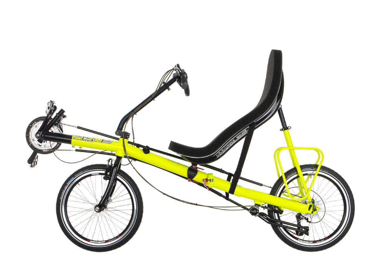 In 2008, we attempted to make a cheap recumbent. We wanted to offer the pleasure of the riding comfort of recumbents to be experienced by people in countries where incomes are not so high. That is, in our country, the Czech Republic, Poland, Romania or Hungary. We devoted a lot of effort, time and money to this project and managed to create some interesting prototypes, including a steel recumbent without suspension with a 20” front wheel and 26” rear wheel. Eventually, our favourite aluminium and the “dual 20” model won. AZUB ECO 20 was an excellent stable bike which was also very easy to handle thanks to its compact dimensions. It was also exceptional due to its interesting features, such as the beautiful adjustable aluminium seat. We also made several models with 16” wheels for children or for small people. Although not much interest came from Eastern Europe, there was some from France or Japan. Nevertheless, we have never wanted to spend our time thinking where to cut corners in order to reduce the cost, so soon we began to improve it instead. The last step was adding a folding mechanism, thus turning the AZUB ECO 20 into AZUB Origami. A recumbent small in size yet large in riding properties.
