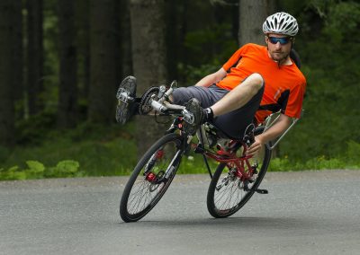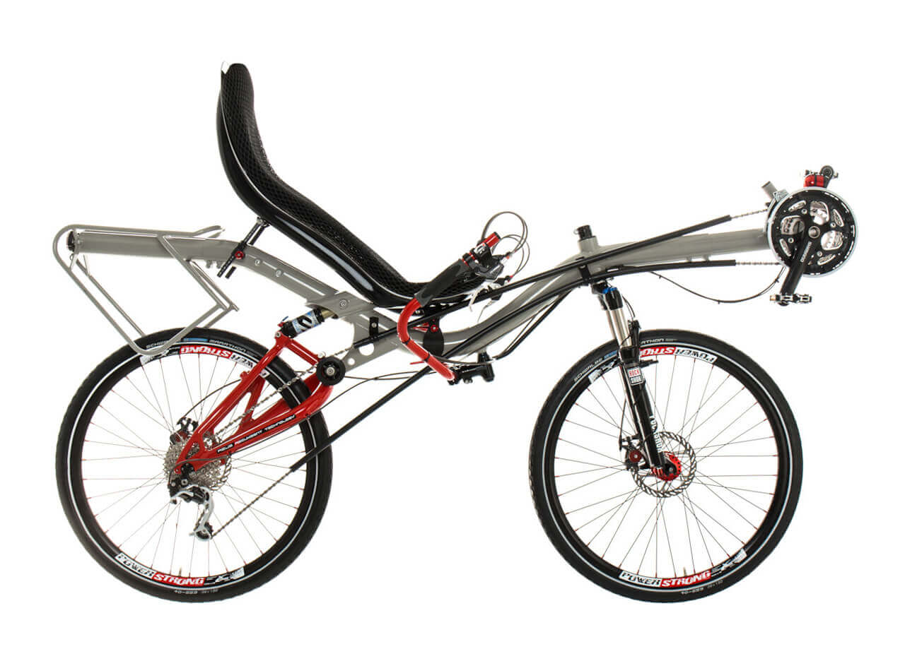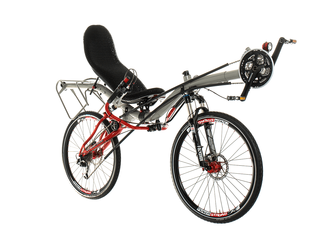 The MAX is a recumbent bike for active cyclists who enjoy a fast ride and great challenges. Unlike our recumbents with a 20” front wheel and 26” rear wheel, it has a more sporty seating position, characterized by the crankset being placed higher than the bottom of the ergonomic seat. The rider is thus better seated and can put more power in the pedals.