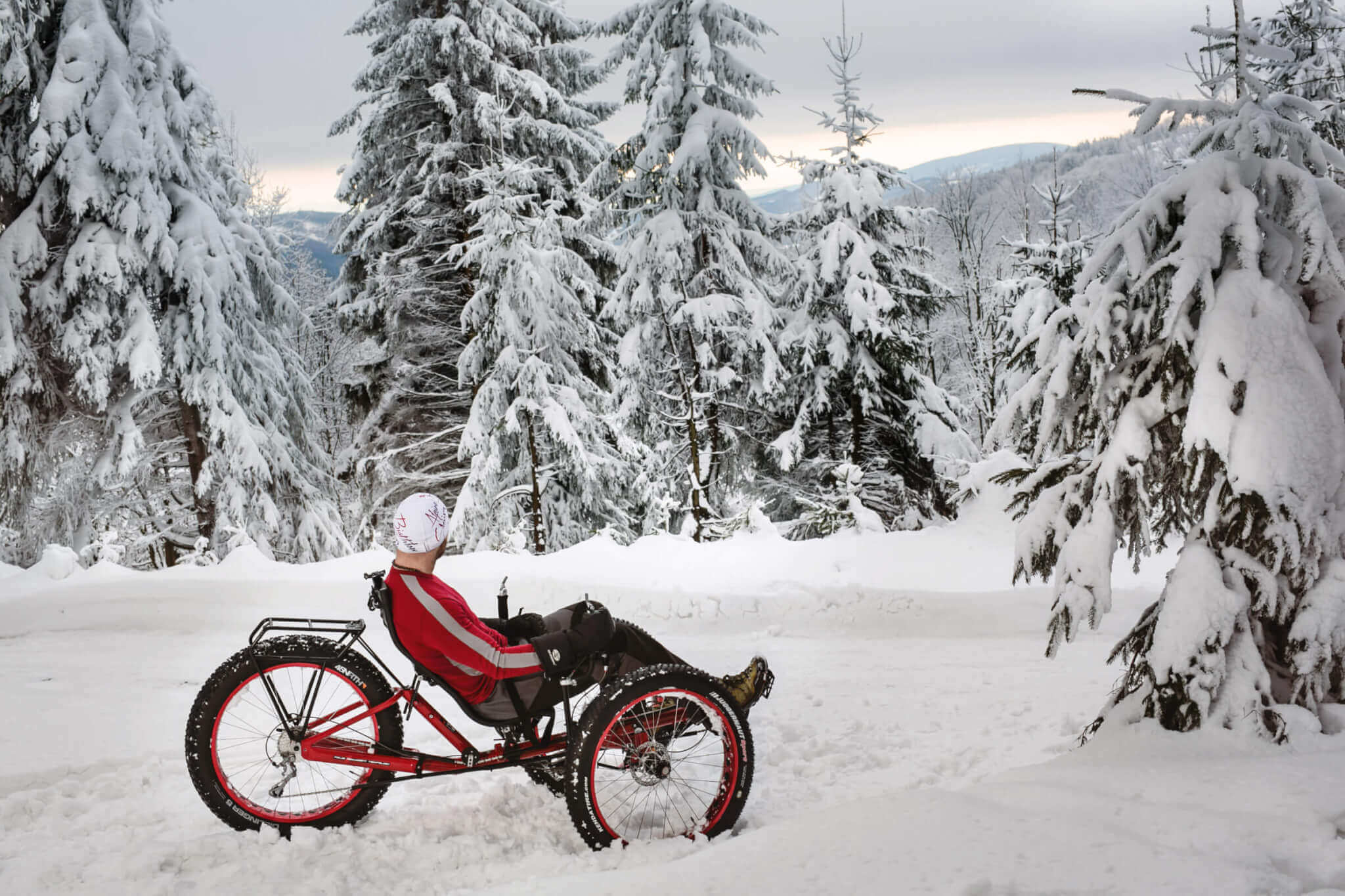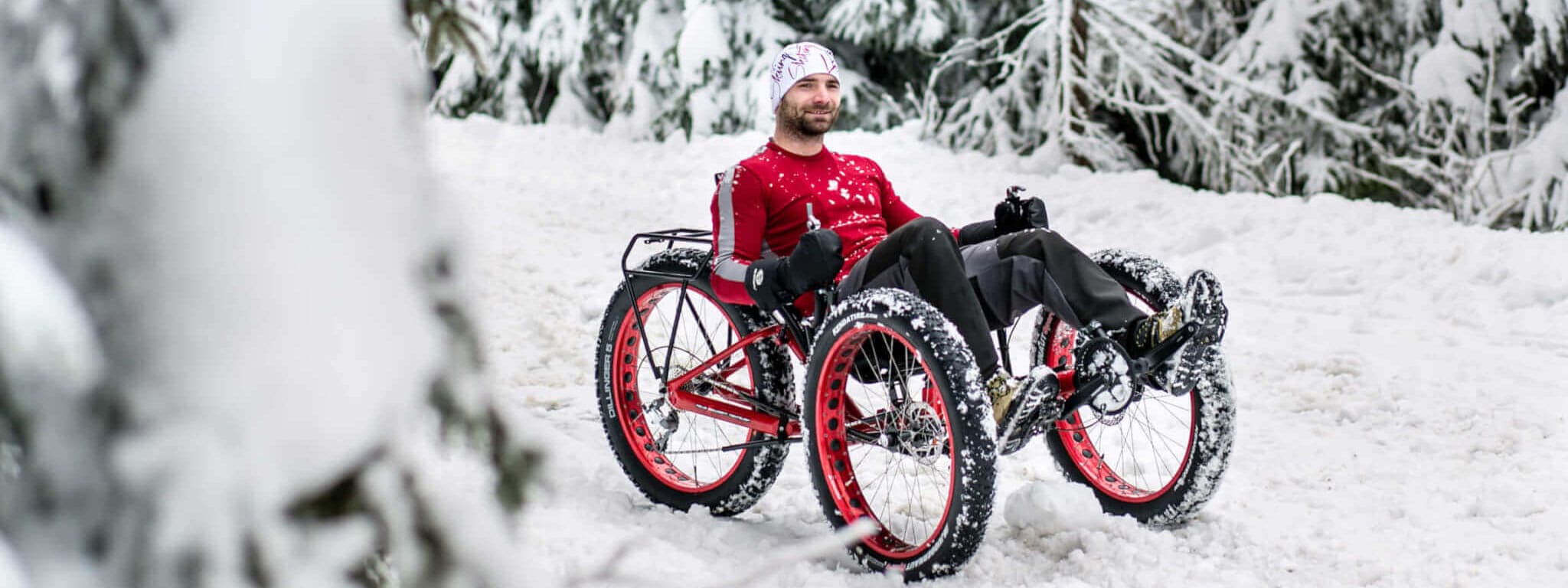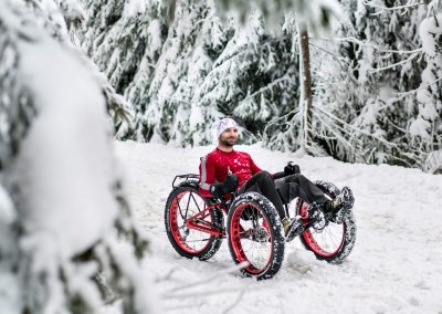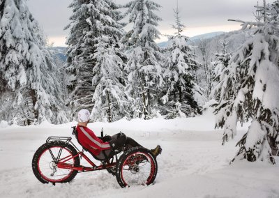 To make sure this trike would be perfect for you, we have worked hard on the components as well. The basic equipment includes red anodized rims with two rows of holes made in Italy, excellent hubs with industrial bearings and four inch Schwalbe Jumbo Jim tyres. However, you can also go for such delicacies as the FAT version of the popular 14-speed Rohloff gearbox or the 18-speed Pinion P1.18, which provide the much needed very “slow” gears, so suitable for the FAT trikes. With these gears you will be able to manage even some very steep climbs. The whole range is then supplemented by many accessories, such as the ultra-durable rack by the famous German brand Tubus, built specifically for bikes of the FAT type.