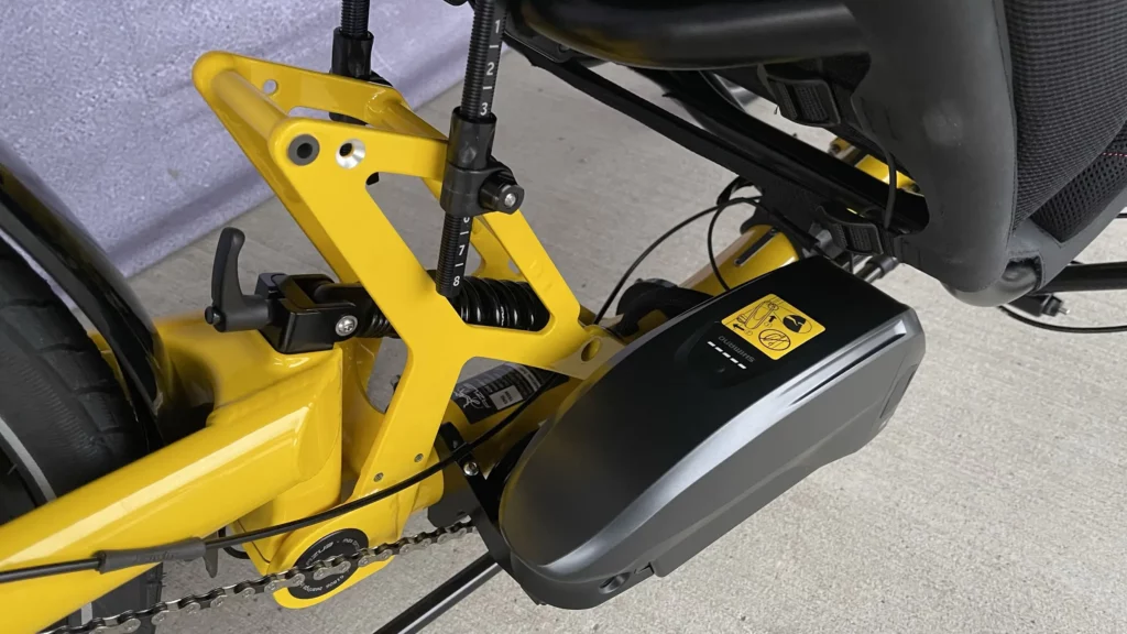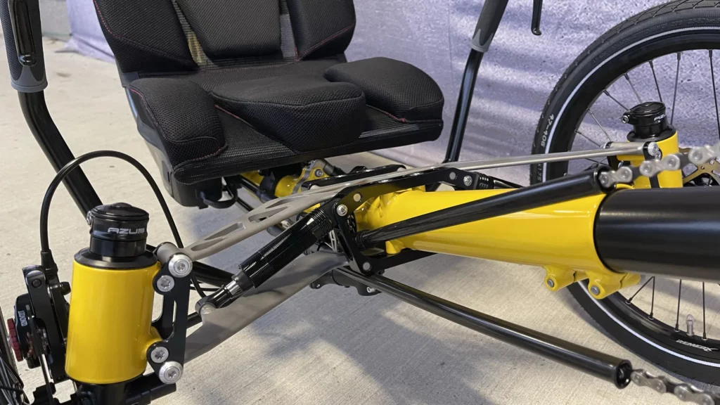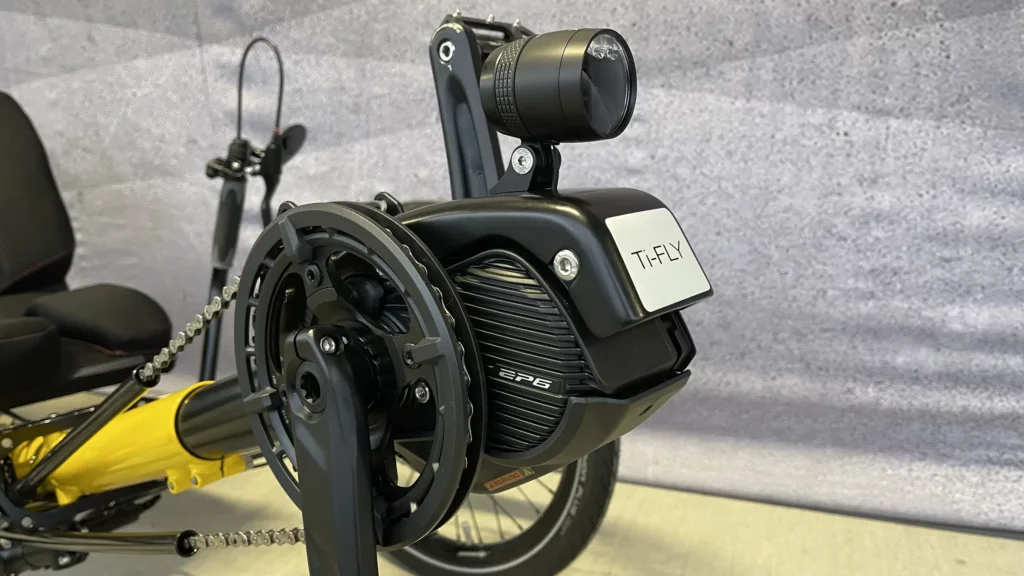 This is our top model in the form of full suspension electric recumbent trike AZUB Ti-FLY 26 with a new Shimano Steps EP6 motor and a huge 630 Wh battery. The whole system is topped off with a Busch und Muller IQ-X E front light, which is powered by the main e-bike battery and provides up to 150 lux of light output and premium design. Our ultra-comfortable Dream Seat is also not to be missed.