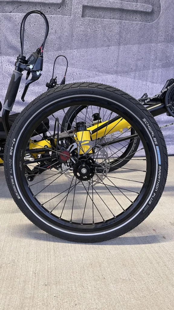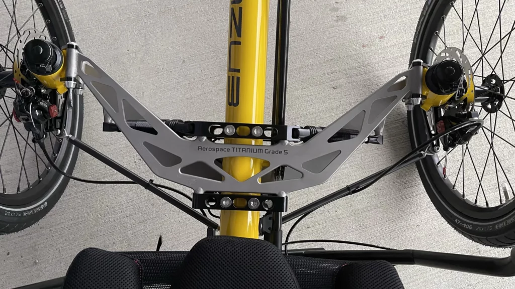 And to bring the overall balanced look to perfection, the customer chose our Black Edition option for this taxi trike, i.e. small anodized details in black instead of red. Thus, not only all the quick-releases are black, but also the lever of the folding mechanism or the mounting frames of the titanium front suspension.