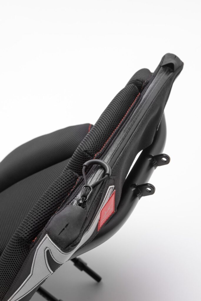 Other necessary details are the asymmetrically shaped reflective surfaces at the back of the seat, where you will find the seat size designation too. In the upper part of the backrest, there is also a large pocket the size of an A4 / US letter with two inner pockets and a waterproof zipper. The zipper is equipped with a comfortable pull for easy opening. Of course, there must also be holes for placing the flag in the seat tube.